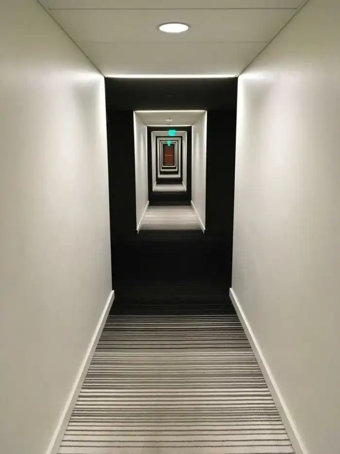 Коридоры некоторых отелей так удачно подсвечены, что в совокупности с напольным покрытием дают потрясающий иллюзорный эффект.
