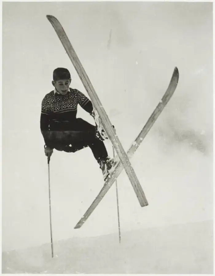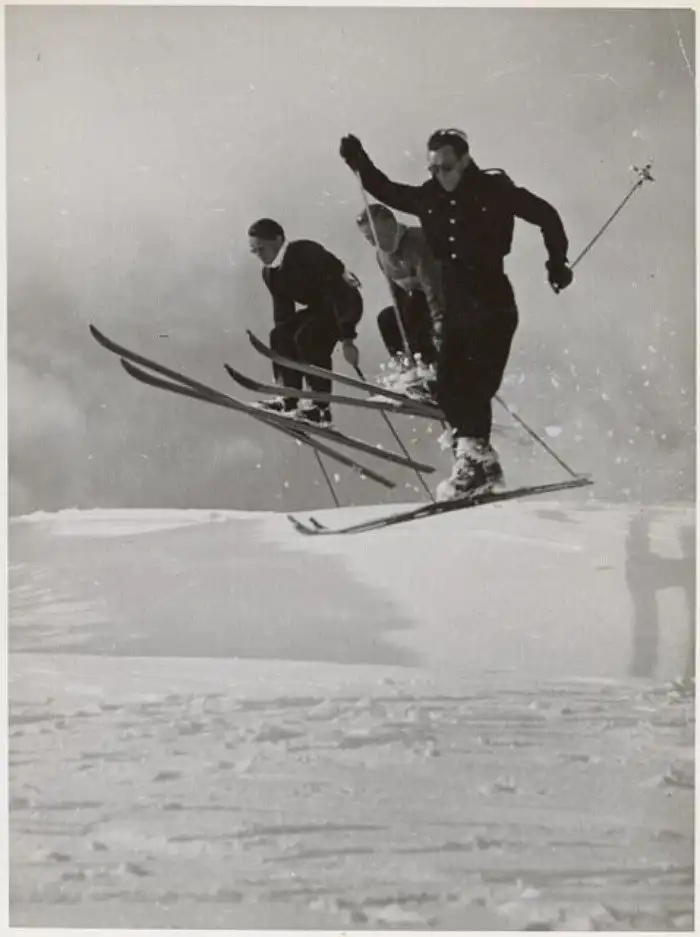 13. 1942 год. Мужчины прыгают на лыжах с трамплина в горах Нового Южного Уэльса, Австралия