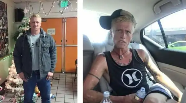 На первом изображении парень имеет спортивно сложённое тело и свежее лицо, тогда как на втором кадре лицо Бишопа выглядит более измождённым и исхудавшим, кроме того, на его руках отчётливо просматриваются следы от внутривенных инъекций.