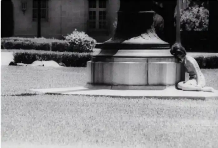 Девушка прячется за статуей, в нескольких метрах от неё лежит раненый снайпером Чарльзом Уитманом человек. Уитмен забаррикадировался на самом верху 27-этажной башни Техасского университета и в течение полутора часов стрелял из винтовки с оптическим прицелом