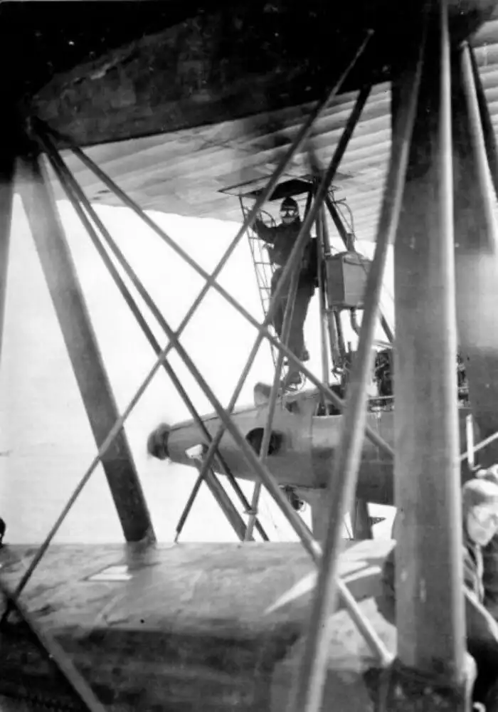 Воздушный стрелок поднимается к верхней крыльевой стрелковой точке немецкого бомбардировщика Zeppelin–Staaken