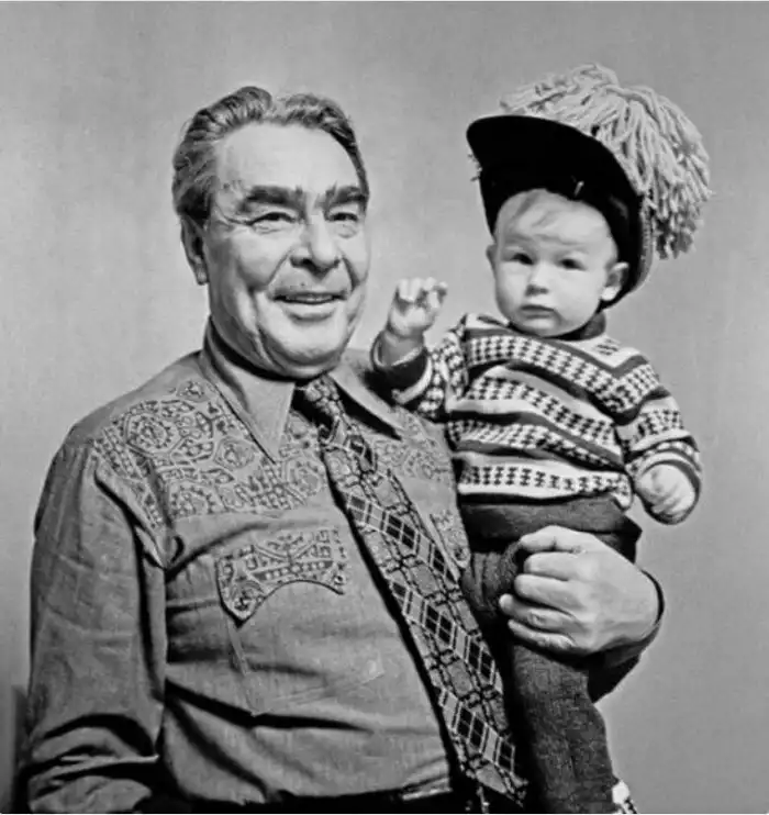 Генеральный секретарь ЦК КПСС Леонид Ильич Брежнев с правнучкой Галей, 1973 г. Рубашка генсека имеет американское происхождение, а вот шлем на ребенке явно подарок из Англии