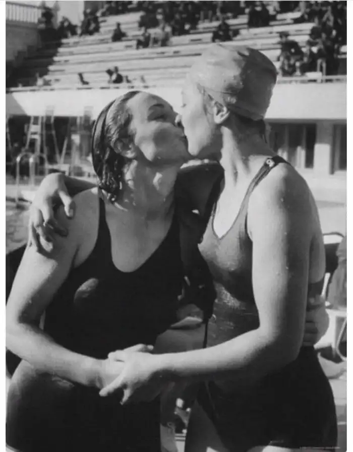 Мария Гавриш (слева) поздравляет Елену Коваленко, которая победила ее во время соревнования по плаванию брассом на Спартакиаде народов СССР в Москве, 1956 год