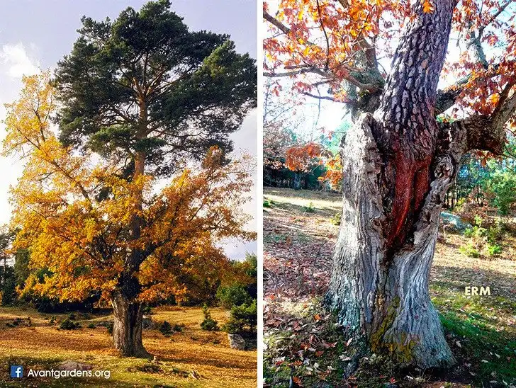Ствол дуба стал домом для белой сосны. Деревьям уже больше века