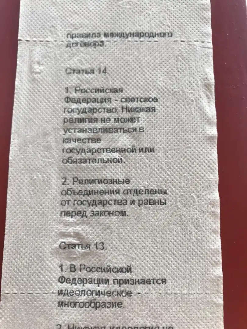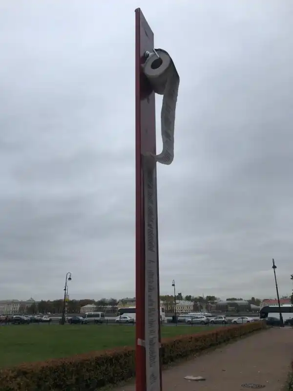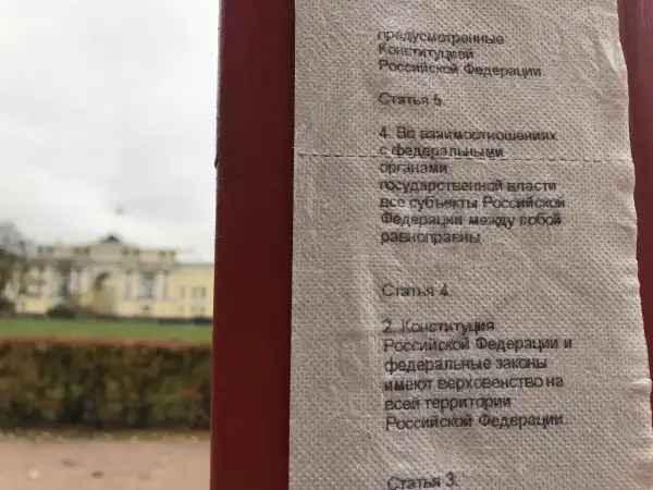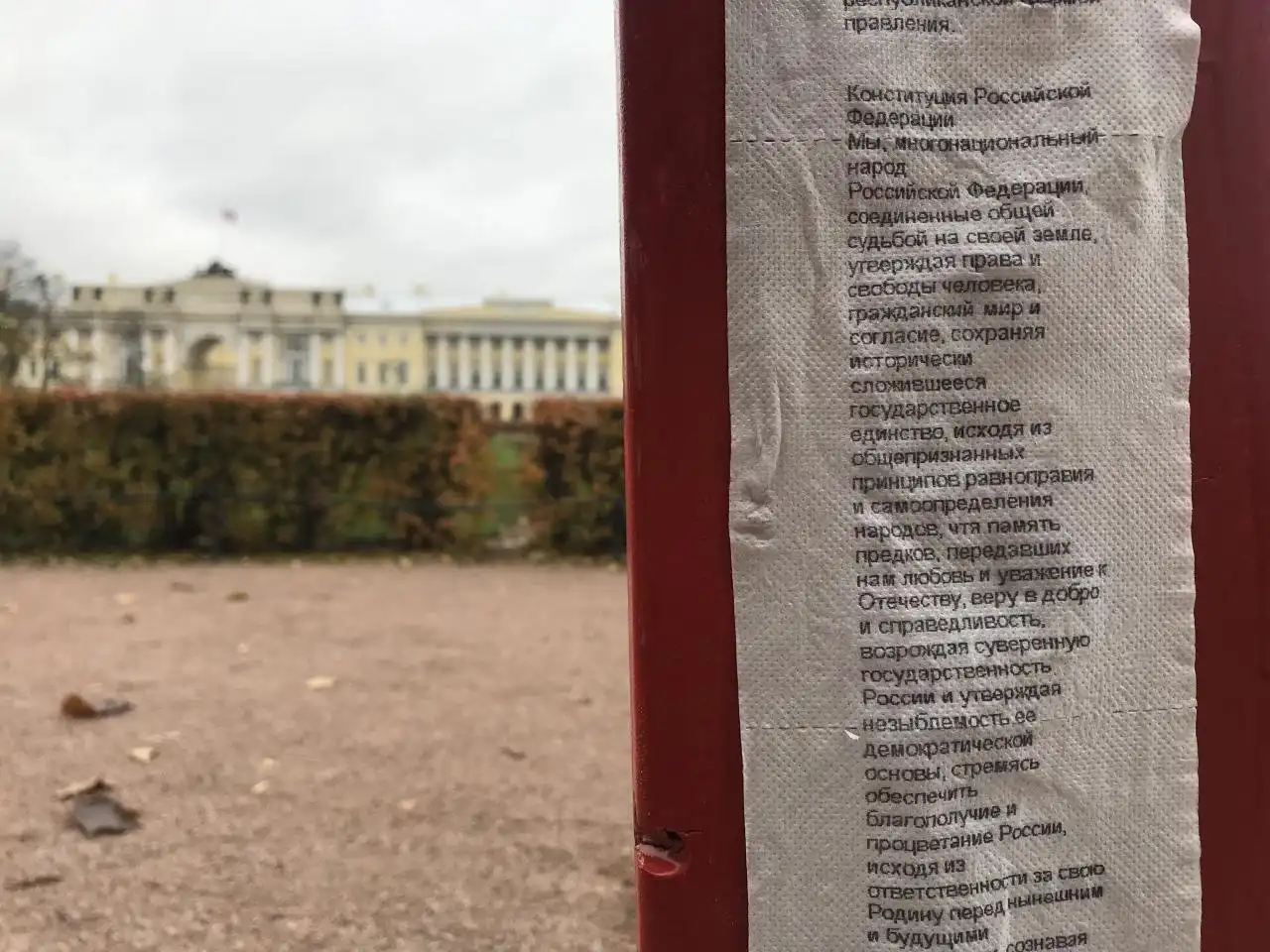 Аноним установил довольно своеобразный объект напротив конституционного суда в Петербурге. Композиция представляет собой балку, на которой закреплена туалетная бумага. Однако самое интересное как раз на бумажном рулоне — на нём был распечатан текст конституции Российской Федерации. Само собой, блюстители порядка убрали «арт-объект» уже через 30 минут после его установки. Однако на фотографии мы с вами посмотреть можем.