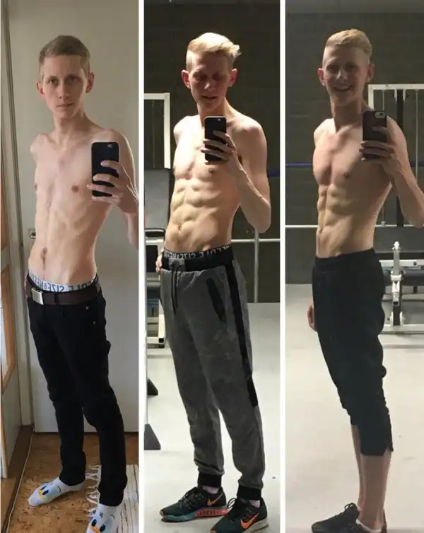 "18 и 20 лет. Решил пойти в спортзал, чтобы поработать над своим телом. Лицо тоже изменилось"