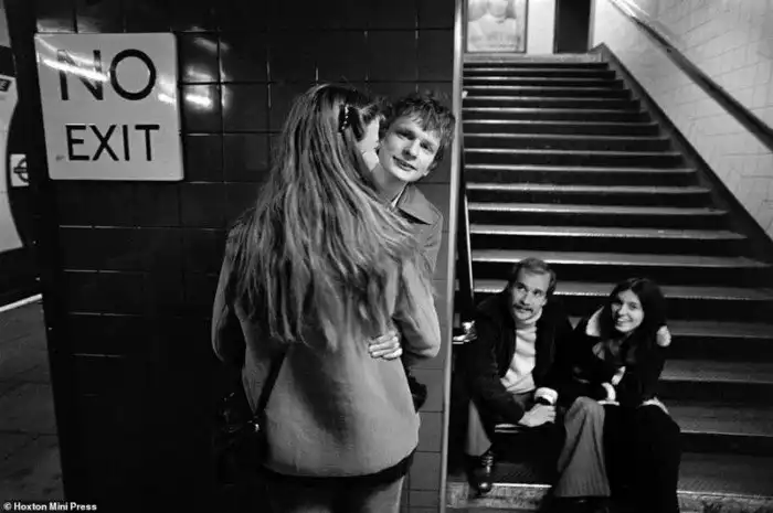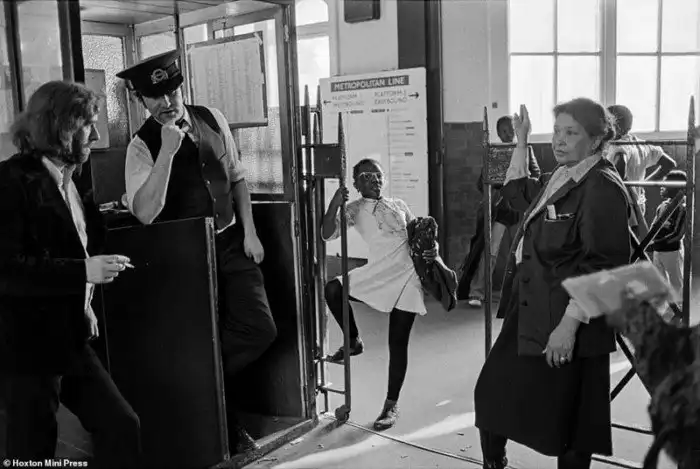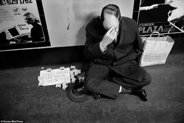Станция на Тоттенем-Корт-роуд, 1977. Мужчина просит у прохожих денег в обмен на коробки спичек