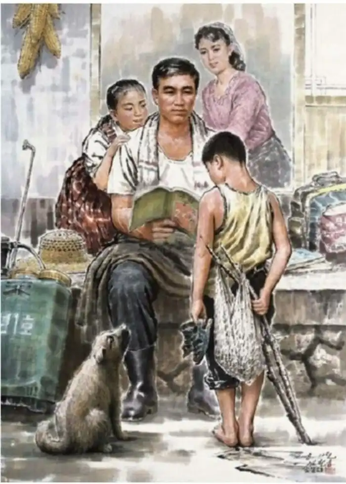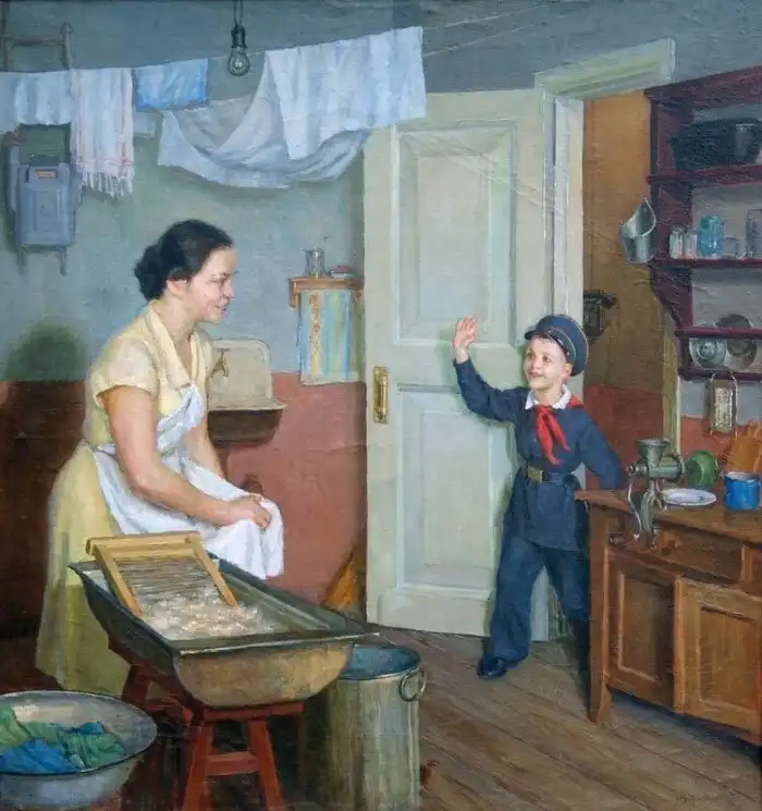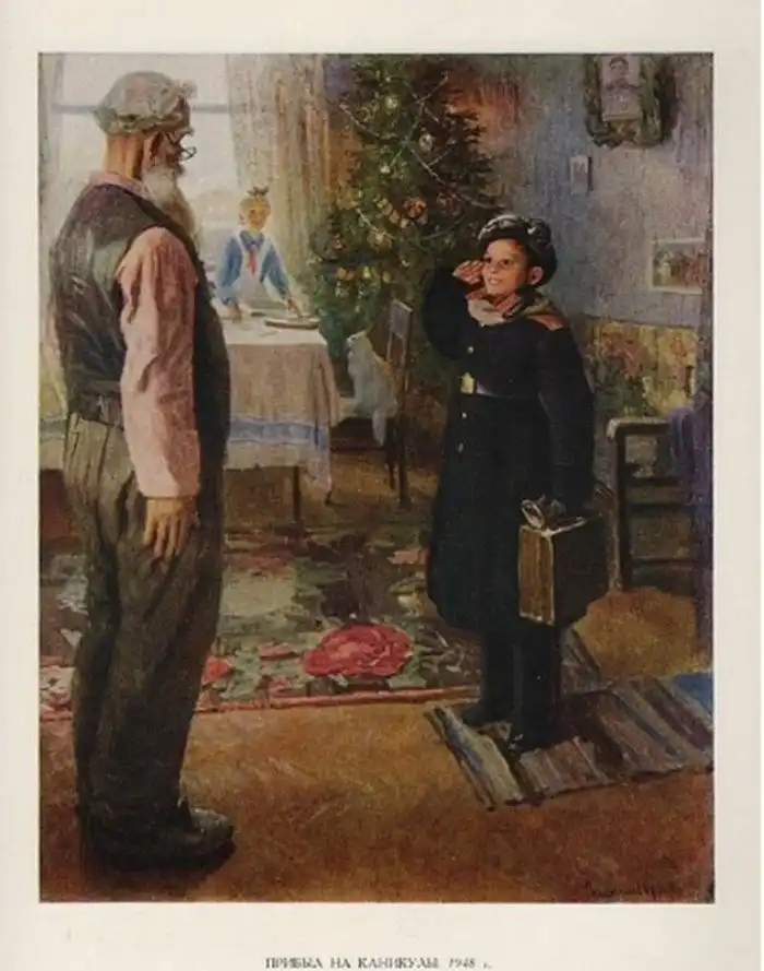 Не подумайте, что Решетников всю жизнь воспевал двоечников и их унылый быт. Вот картина, «Прибыл на каникулы» написанная еще в 1948 году. Судя по всему здесь мы видим юного суворовца, у которого все в порядке и вполне довольных таким раскладом родственников.