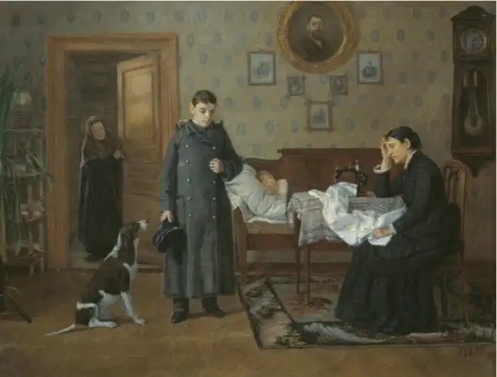 Только у Жукова все более пессимистично. Сестра главного героя, очевидно, больна и лежит в постели, а мать одета в традиционный для дореволюционного периода траурный наряд вдовы. Так что картина обманутых надежд здесь более яркая и трагичная.
