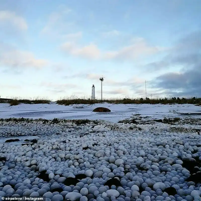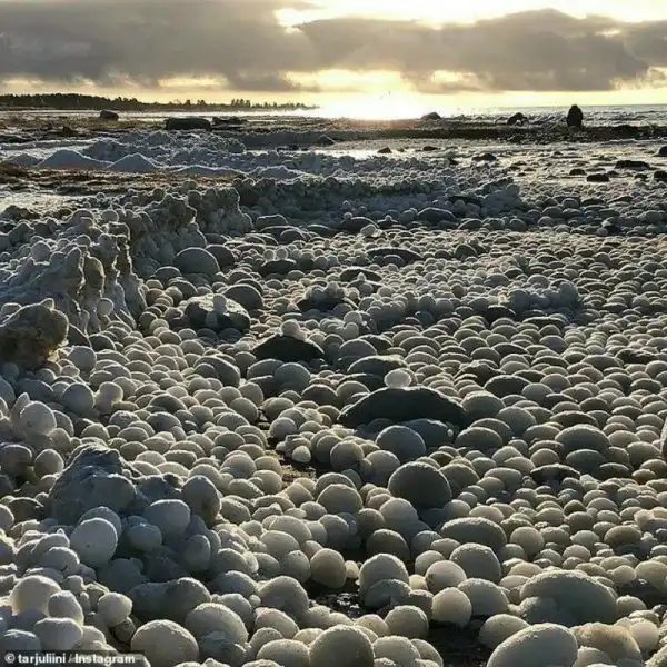 Очевидцы запечатлели необычное явления у берегов Финляндии. Все побережье было покрыто яйцевидными ледяными образованиями. Удивляет то, что все шарики были почти идеальной формы — да уж, чего только природа не сделает!