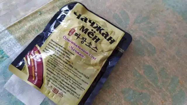Вот так выглядит соус под название Чачжан мён. В описании говорится, что лучше, прежде, чем выливать его в лапшу, хорошенько разогреть, что я и сделал. Сваренную в 600 мл воды лапшу сливаем и оставляет две чайные ложки воды. После этого опускаем в едьбу этот чудо-пакет.