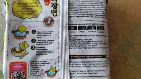 Как понятно из изображения на упаковке, нас ждет что очень сытное и корейское. По факту же не совсем так. В комплекте обычная по виду лапша (прямоугольный брусок) и внушительный пакет с соусом. Про премиум лапшу я не шучу — об этом даже на упаковке сзади написано. Кстати, в отличие от обычного бомж-пакета, эту лапшу надо отдельно варить 5 минут. У меня даже жена спросила: что ты делаешь, зачем? Почему тупо не залить водой? Потому что лапша все-таки другая (может толще, может, сорт другой, хз)— она тупо не успеет завариться.