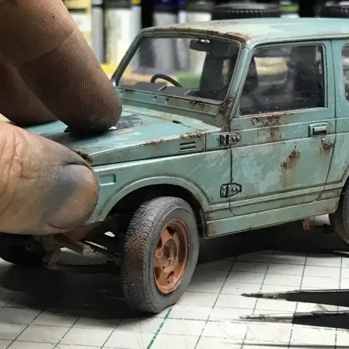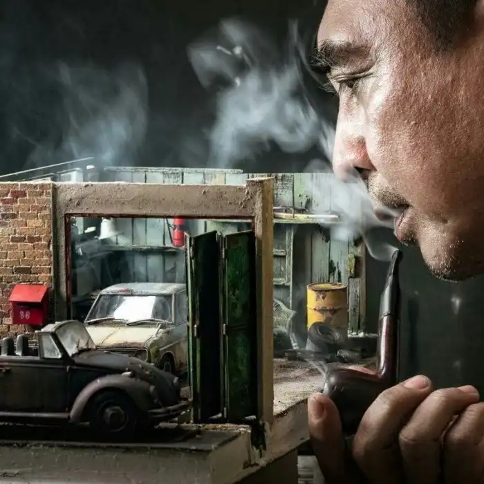 Создавать такие реалистичные сценки Эдди помогает, как сейчас говорят, богатый бэкграунд: когда-то он много занимался живописью, а его первым бизнесом – еще до фотографии – была архитектурная фирма. Но ради своих диорам художник осваивает и весьма экстравагантные материалы, задействуя то, что оказалось под рукой в буквальном смысле. Например, фактуру ржавчины на кузовах автомобилей он имитирует при помощи обычного табачного пепла: на многих фотографиях Путера запечатлен со своей любимой трубкой, так что за материалами для работы ему далеко ходить не надо. В дело идут песок, глина, камни, сухие листья, проволока, вата, воск, эпоксидка и даже травы, которые можно найти на любой кухне – петрушка, базилик и прочие орегано с тимьяном.