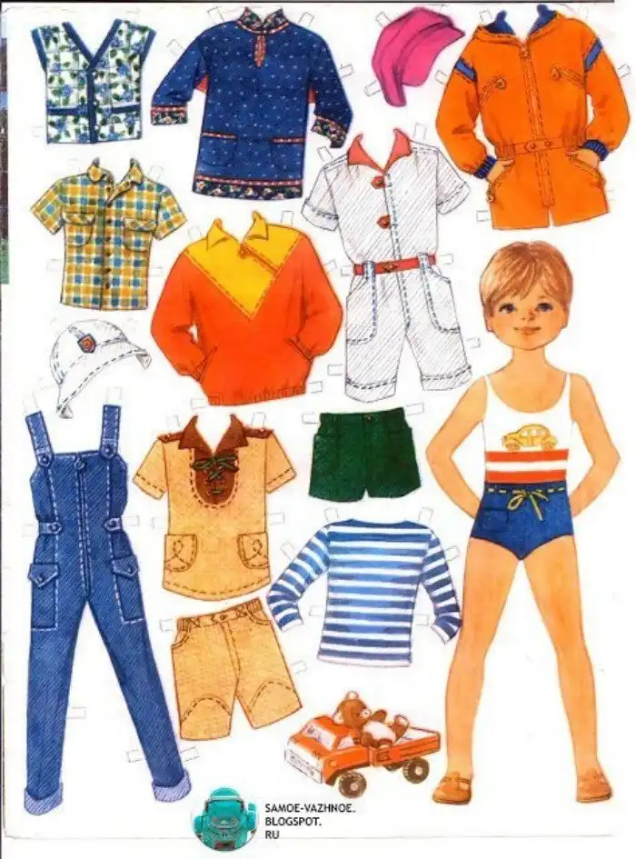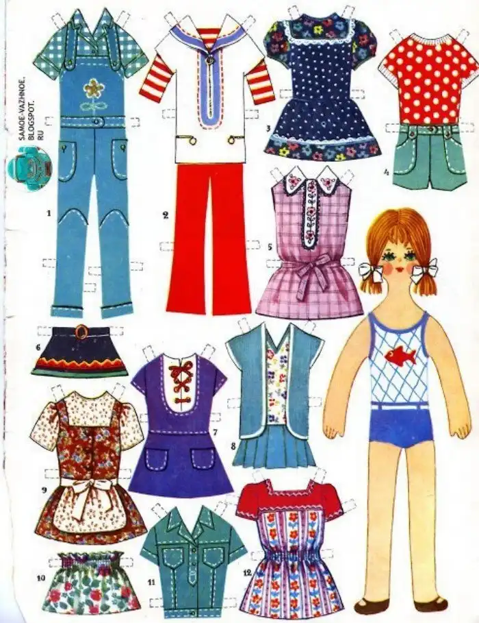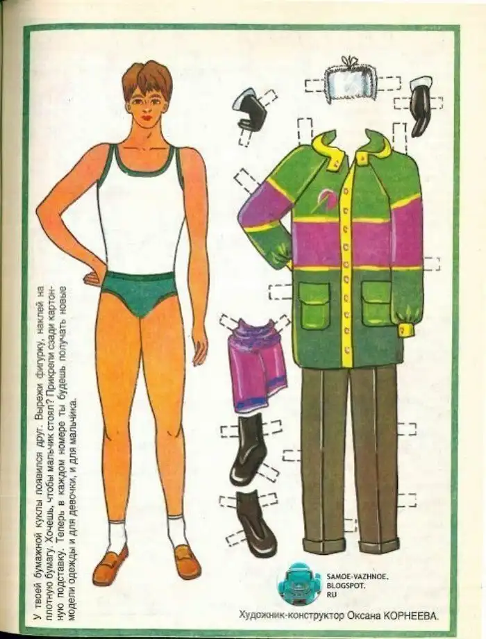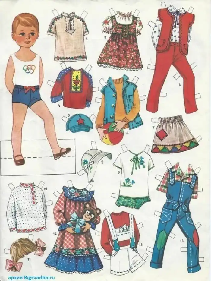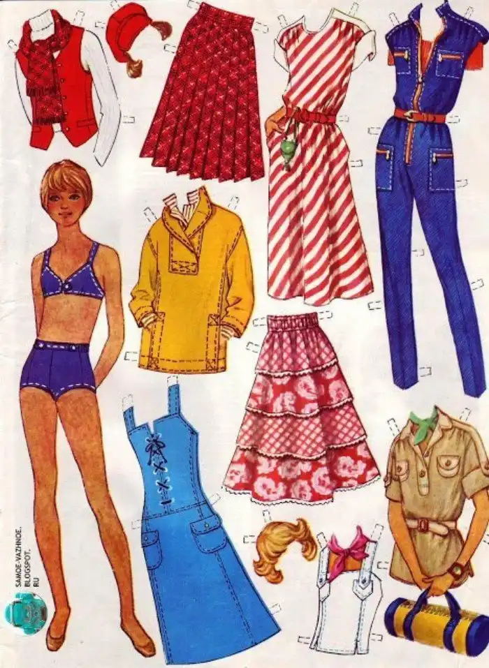 Заголовок шутка - вдруг кто не понял. На самом деле это ностальгии пост для тех, кто помнит эти простые и в тоже время удивительно яркие и чудесные бумажные игрушки, развивавшие в нас чувство стиля, тягу к моде, дизайнерские способности и умение вырезать. Нарисованный на плотной бумаге силуэт девочки, мальчика или ребенка нужно было одеть в предлагаемую одежду и разнообразие этой одежды было очень велико