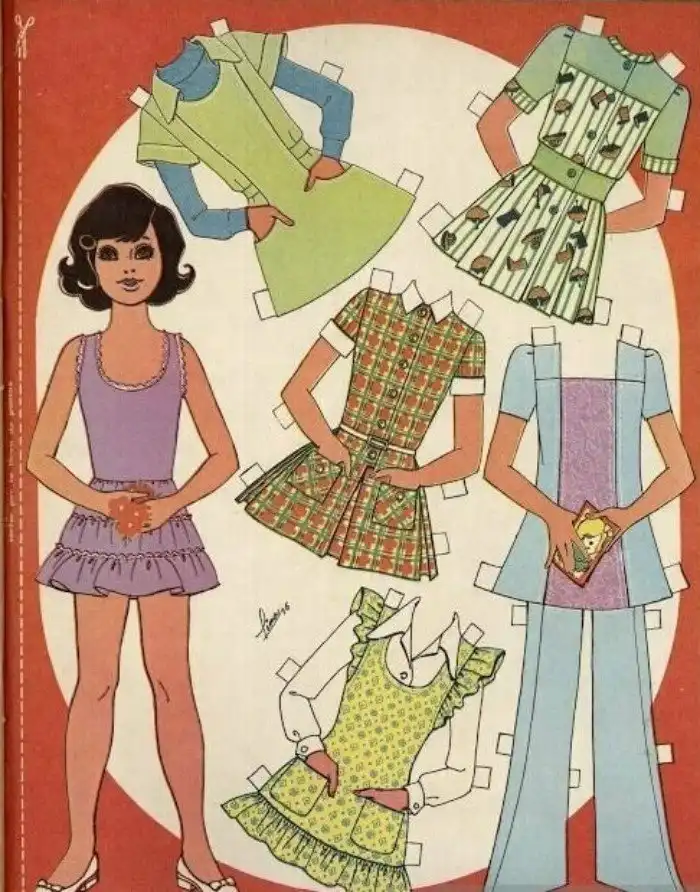 На самом деле все очень просто, для тех кто не в курсе - одежда рисовалась со специальными "плечиками" которые следовало загнуть за плечи фигурки и вот она уже в платье или костюме