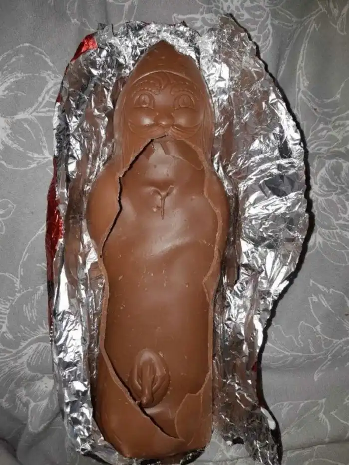 Клиент супермаркета решил купить шоколадку в форме Деда Мороза, но когда он развернул шоколадку заметил что-то странное.