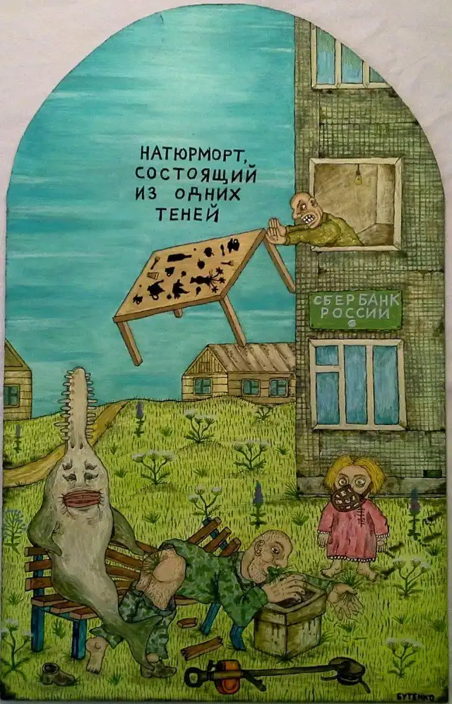 Художник Евгений Бутенко, живет в глуши Ленинградской области, работает скотником в колхозе и рисует чудесные авангардные полотна.