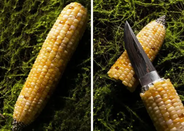 Нож в виде кукурузного початка из янтаря и дамасской стали