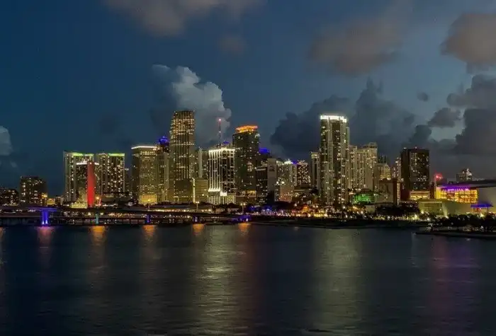 Уже стемнело. Вид на деловой центр Майами со стороны залива.