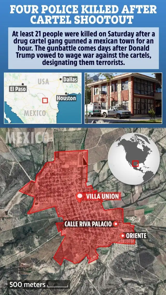 В субботу сразу после полудня в мексиканском городке Вилья Уньон, недалеко от границы с Техасом, произошла перестрелка. В город прибыла колонна пикапов с вооруженными людьми, которые открыли огонь по административным зданиям. Черные грузовики были помечены инициалами: CDN (картель Северо-Востока). Прибывшая группа обстреляла офис мэра города и более часа боролась с полицией.