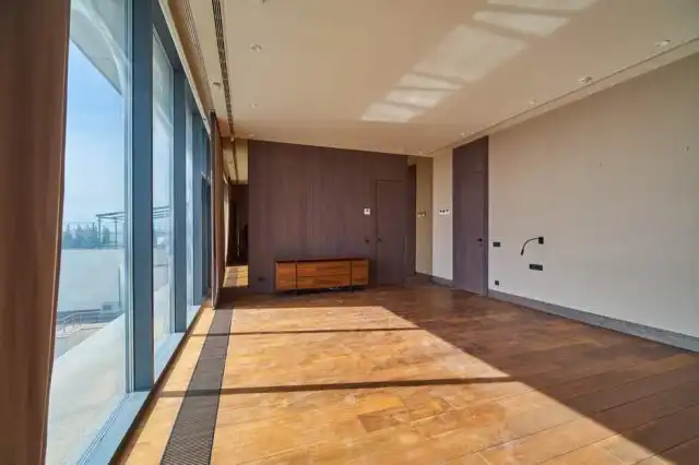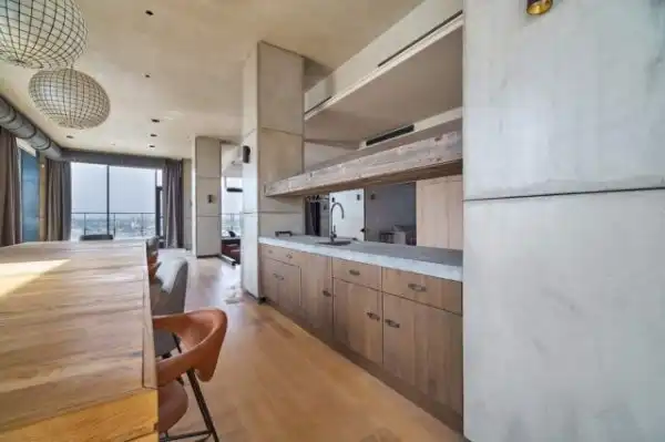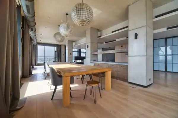 В апартаментах имеется три спальни, комната для массажа с солярием, СПА, зимний сад и помещения для помощников по хозяйству. В жилье сделали дизайнерский ремонт, в основе которого натуральные материалы. Мебелью пространство обставлено частично, поэтому остальное придется покупать.