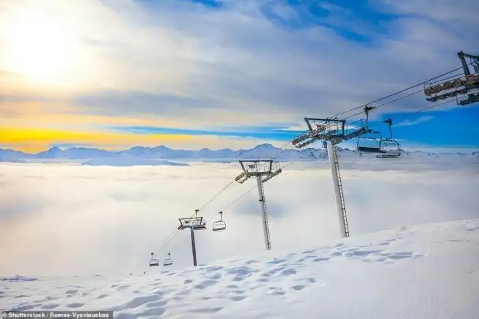 Мерибель - чрезвычайно популярный курорт, расположенный в долине Тарантез во французских Альпах. На этом изображении мы видим красивый закат и один из горнолыжных подъемников.