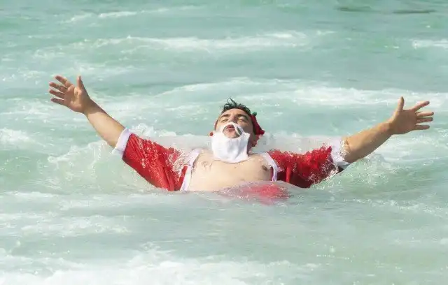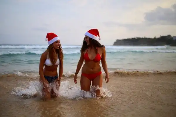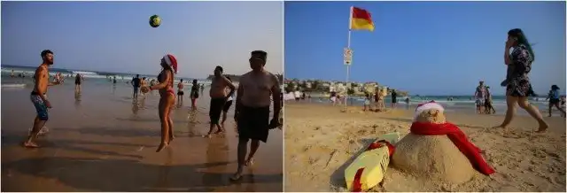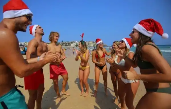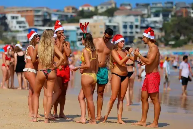 Австралию в этом году потрепало — засуха вызывала огромное количество лесных пожаров, которые бушевали по всей стране. Но это не значит, что все должны грустить и горевать — тысячи туристов и граждан поехали на пляж, где решили отметить рождество. И праздник, проходящий на жаре, с девушками в купальниках и серфингом — это действительно интересно выглядит.