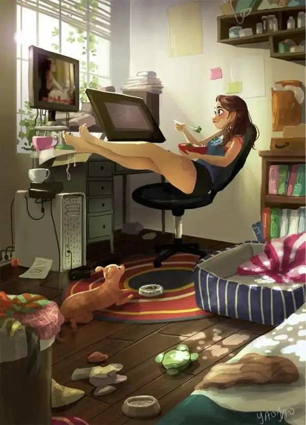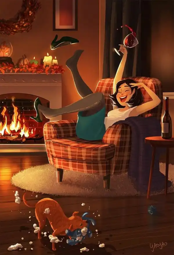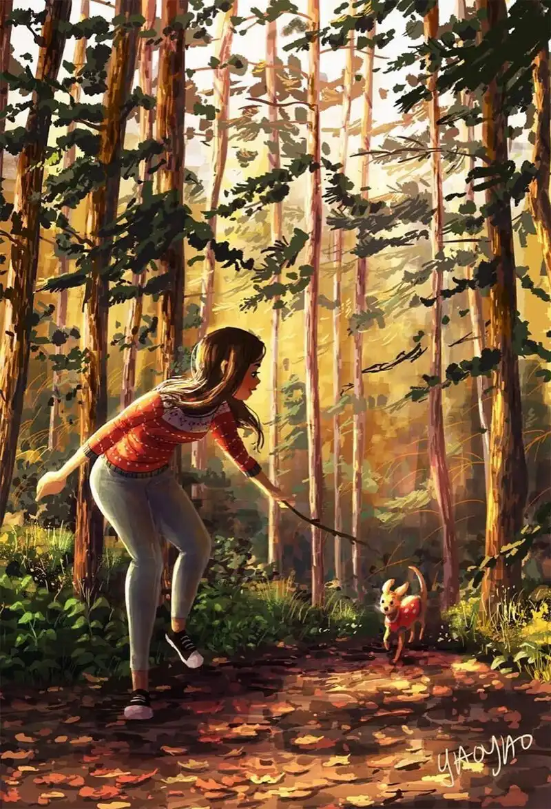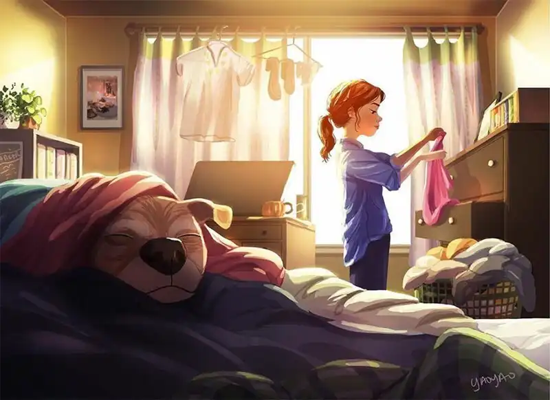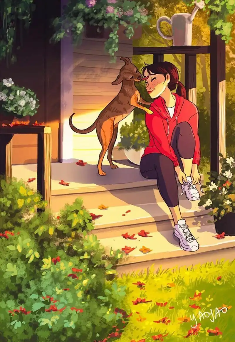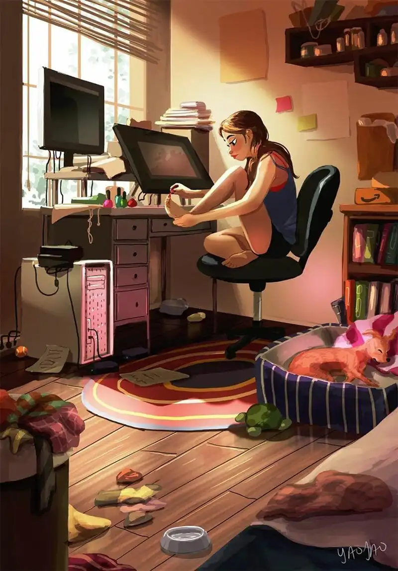 Яояо Ма Ван Ас - профессиональный иллюстратор и аниматор. Она рисовала пейзажи и другие фоны для популярных мультфильмов - например, для "Рика и Морти". Но, кажется, ее основная страсть - это серия картинок про маленькую собачку по кличке Паркер, которая живет у нее дома.