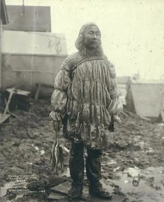 Алеуты-охотники в традиционных головных уборах и непромокаемой одежде из кишок. Аляска, начало 20 века