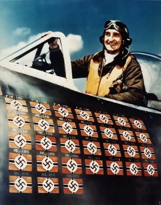 Люфтваффе туз майор Вальтер Осау и его мессершмитт BF109E4. Осау совершил 300 боевых вылетов и совершил 109 подтвержденных убийств. Он был убит в бою 11 декабря 1944 года во время воздушных боев с американскими бойцами над Бельгией