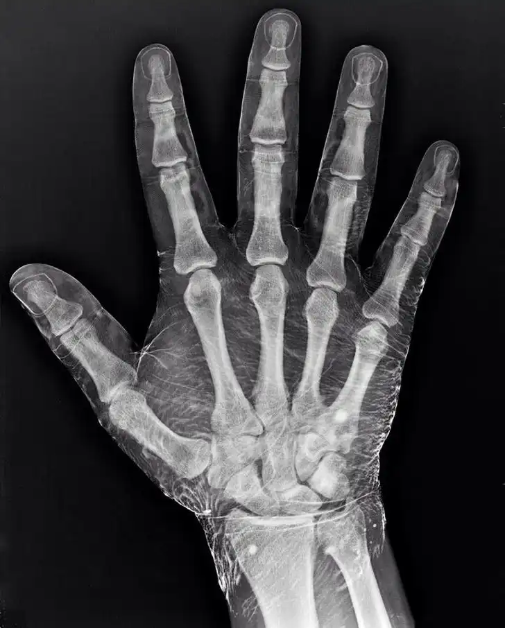 Рентгенография руки, смоченной в йоде. Йод поглощает рентгеновские лучи и подсвечивает кожу вокруг костей, отчего она кажется прозрачной