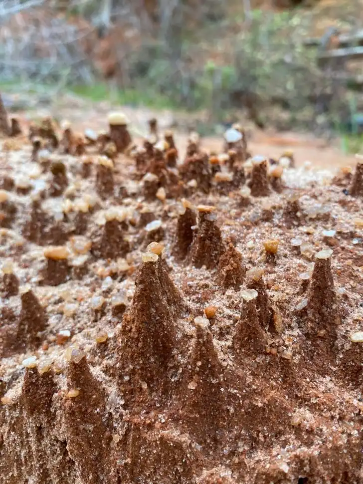 После дождя мягкая глина смылась вместе с водой, оставляя каждый камешек на своем песчаном постаменте