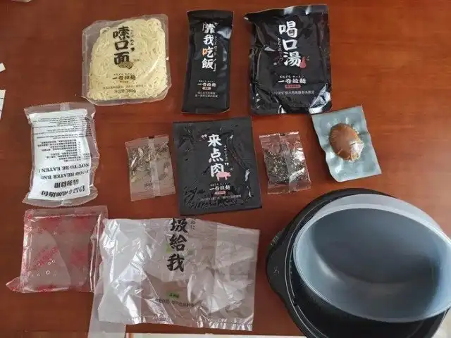 В наборе было ( слево на право, сверху вниз): лапша пшеничная, набор столовых приборов, мясной бульон с грибами, белый пакет с странным порошком, лук сушенный, мясо говяжье пресованное, морские водоросли, традиционно варенное в соусе яйцо, вроде как вода, пакет майка и чашка с чашкой))))