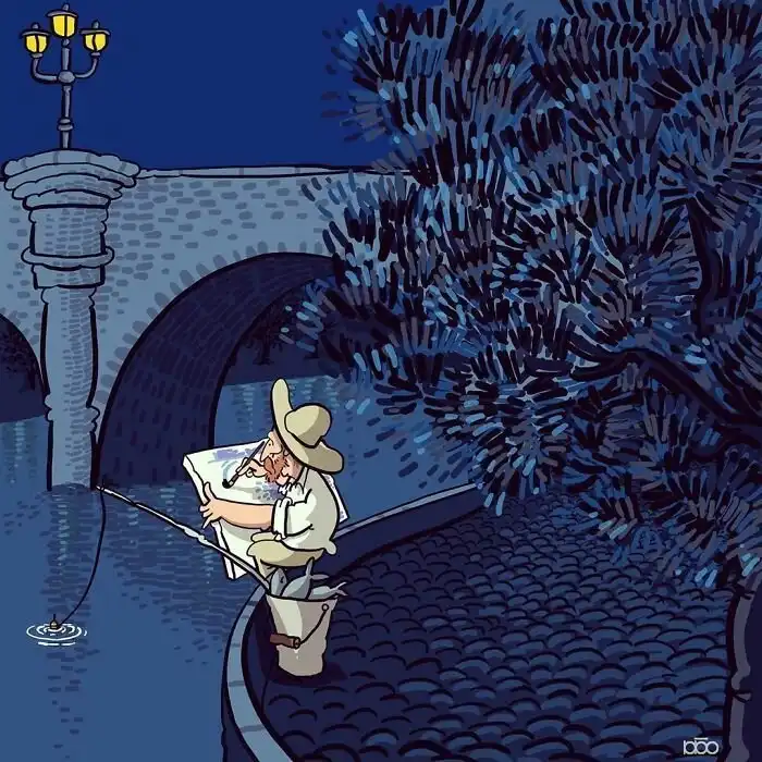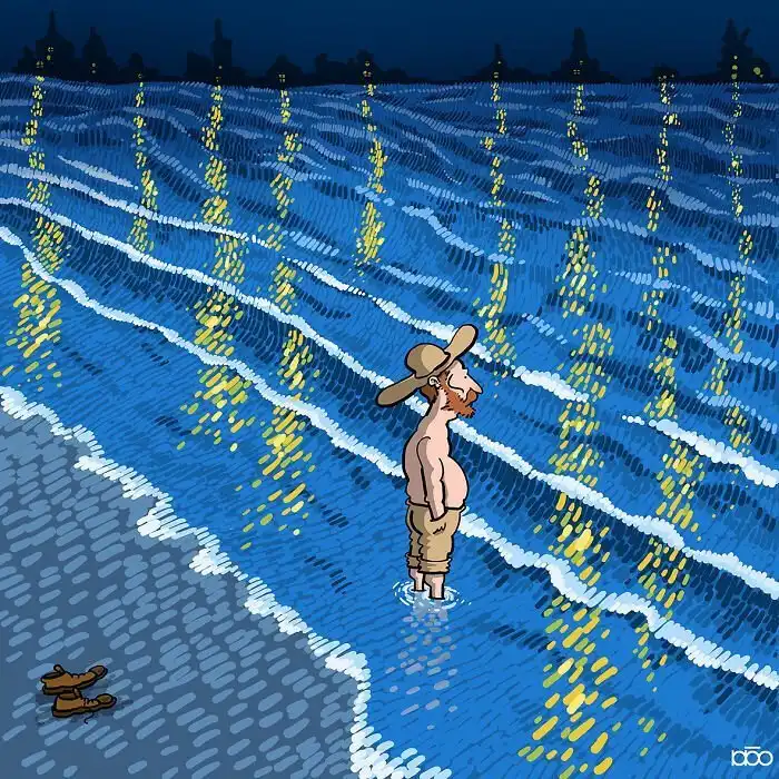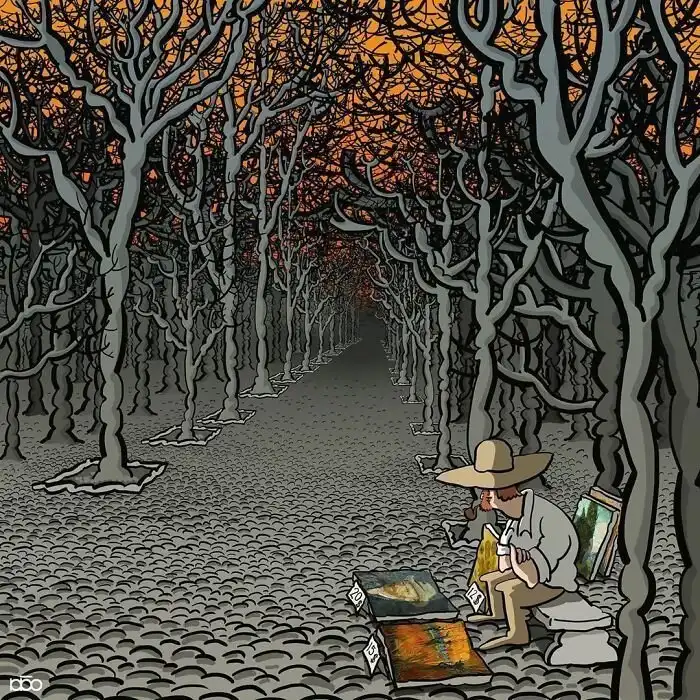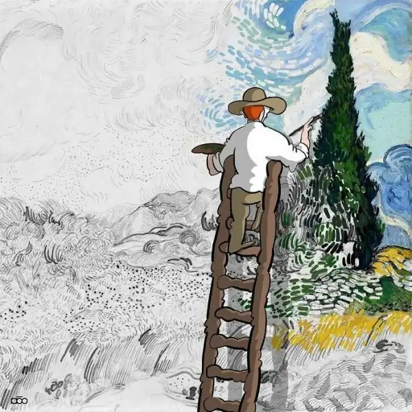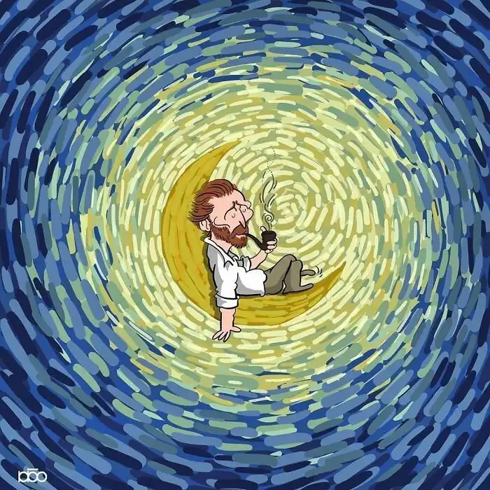 Алиреза Карими Могаддам - иллюстратор и карикатурист из Ирана, ныне живущий в Лиссабоне. Один из любимейших художников Могаддама - Винсент Ван Гог. Серия фантазийных иллюстраций "Жизнь Ван-Гога" - дань этой любви. По словам автора, жизнь этого замечательного художника была трудной и горькой, но основанной на красоте, счастье и надежде на будущее.