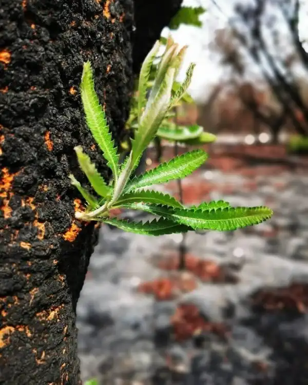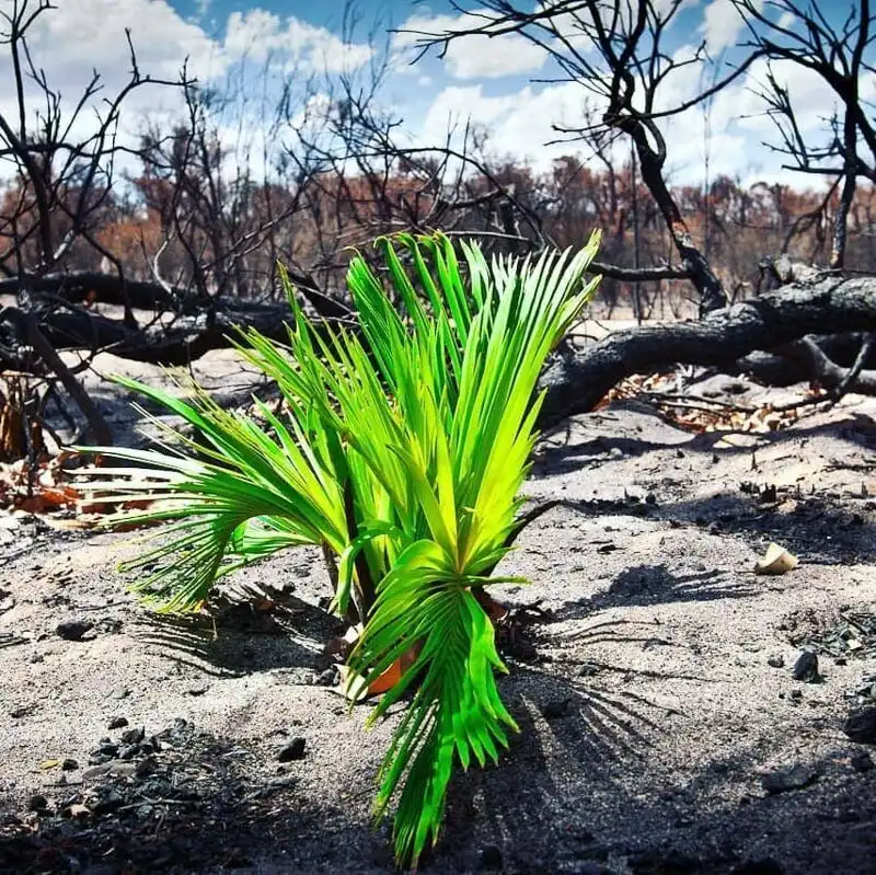 На несчастный материк обрушилось множество испытаний. Но природа всё равно берёт своё и, несмотря ни на что, восстанавливается и оживает, и на обгоревших деревьях появляются зелёные листочки, как символ победы жизни над смертью.