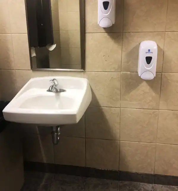 В общественном туалете два дозатора мыла, второй - для людей на инвалидных колясках