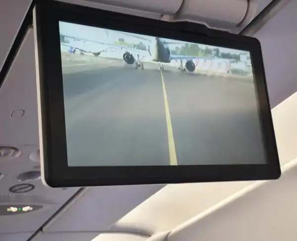 В самолете есть фронтальная камера, которая показывает пассажирам взлет и посадку в режиме реального времени