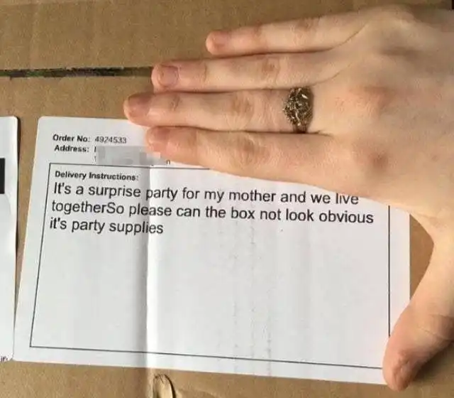 Мужчина живет с матерью и захотел устроить для нее сюрприз: устроив вечеринку. В коробке — всё для мероприятия. "Сделайте так, чтобы она ни о чём не догадалась", — просит службу доставки. Но те дословно пишут его просьбу в инструкции для курьера, прикрепляя бумажку к коробке.