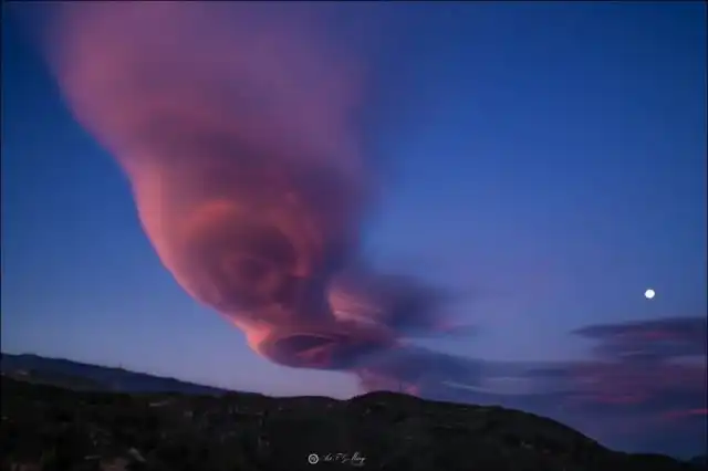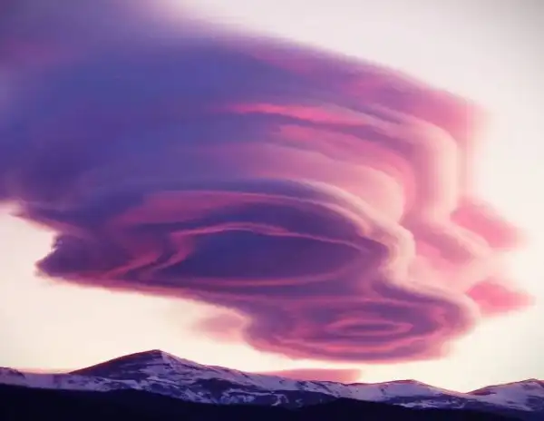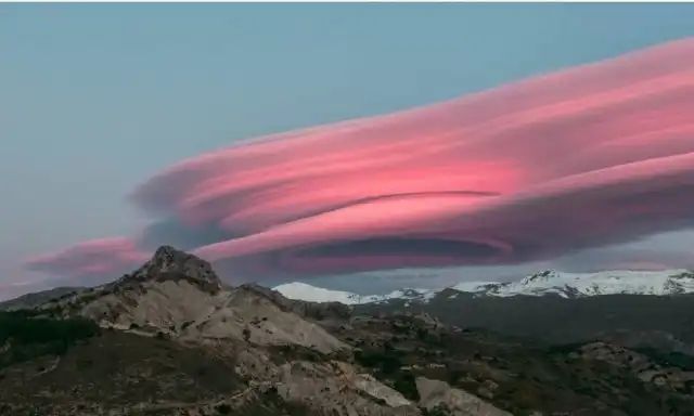 Посмотрите на впечатляющий закат, который накануне могли наблюдать туристы в горах Сьерра-Невада на юго-востоке Испании. Над горным хребтом зависло огромное лентикулярное облако – а благодаря закатным лучам оно приобрело насыщенный розово-пурпурный цвет.