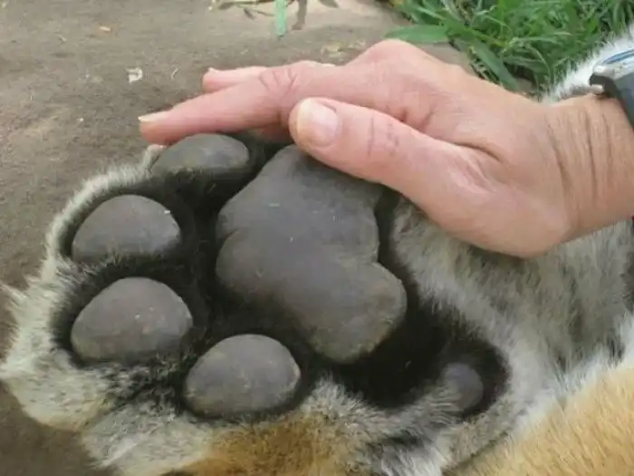 Лапа тигра в сравнении с человеческой рукой