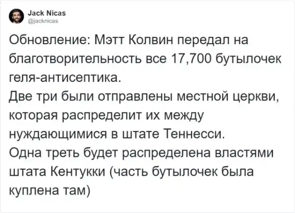 В итоге парень остался сидеть на горе из 17,700 бутылок антисептика, которые он не может продать. Осознав фиаско, жадность Мэтта сменилась на благородство. Он решил отдать накупленное тем, кому товары нужнее.