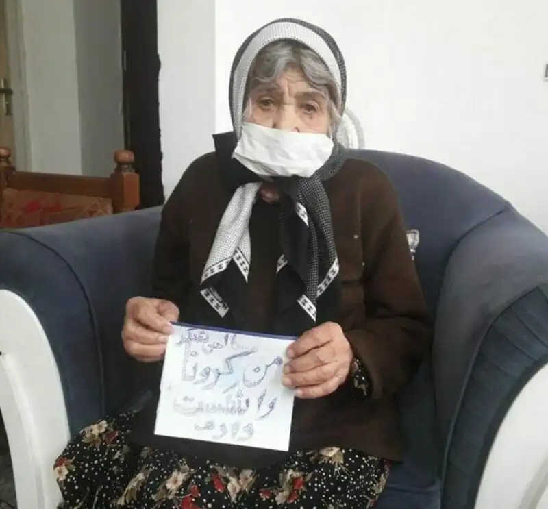 Этой женщине из Ирана 103 года и ей позволили вернуться домой, а на плакате написано "Я победила коронавирус"