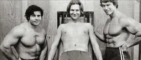 Франко Коломбо, Джефф Бриджес и Арнольд Шварценеггер на съемках фильма "Оставайся голодным", 1976 год, США