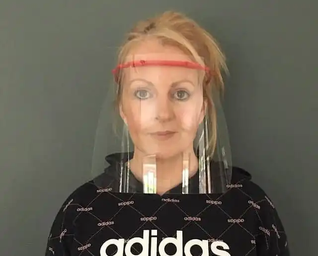 Он делает маски из головного крепления и пластикового козырька. Такой козырек обеспечивает защиту сразу всего лица, но носить его все равно нужно вместе с обычной защитной маской.