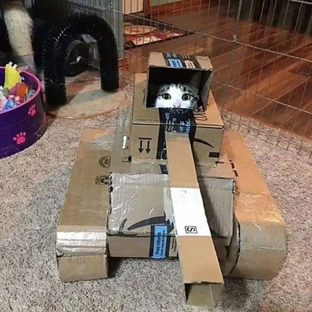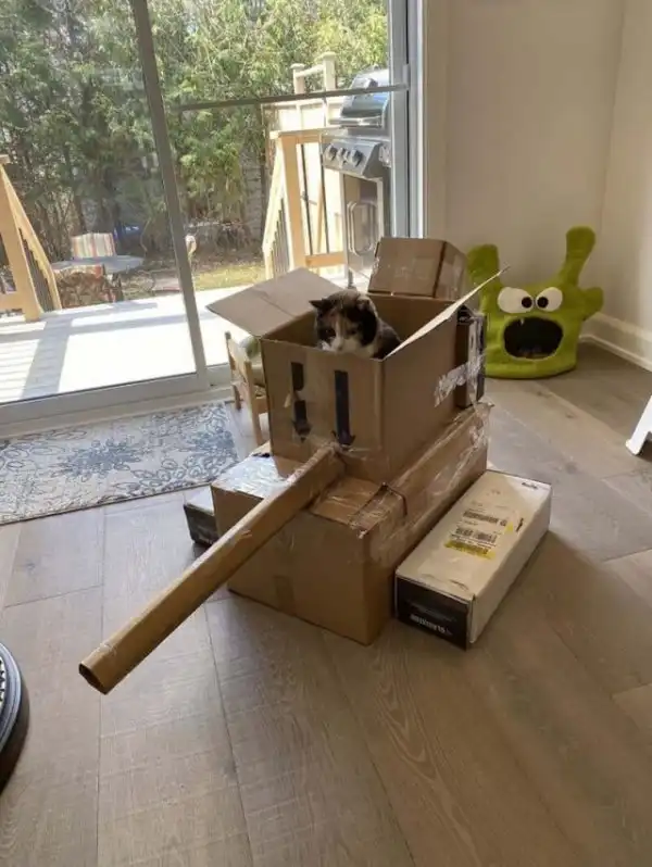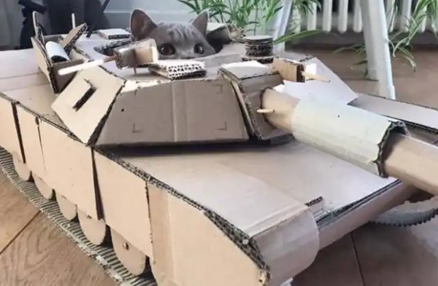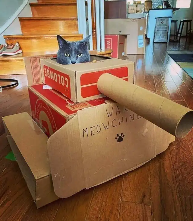 Из-за пандемии коронавируса люди во многих странах вынуждены сидеть дома. И от скуки приходится искать себе какое-то занятие. Авторы этих снимков решили сделать для своих котов бронетехнику из картона. И получилось очень необычно и круто.