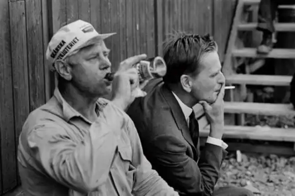 Министр Швеции Улоф Пальме отдыхает с рабочим во время посещения строительной площадки, 1968 год, Стокгольм