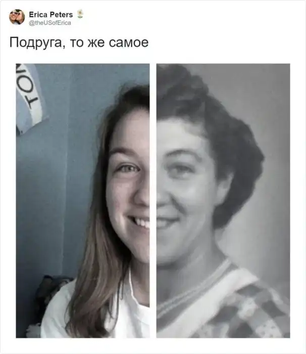 Пользовательница Твиттера под ником contrashelby похвасталась сходством со своей родственницей — по словам девушки, они и так похожи, а макияж и одинаковые наряды вообще превратили их в клонов. Девушка рассказала, что они все похожи — и бабушка, и мать, и она сама. Поэтому её мама была просто рада, что родила своего клона.