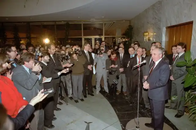 Бывший президент СССР Михаил Сергеевич Горбачев проводит пресс–конференцию после объявления о своем уходе, 1991 год