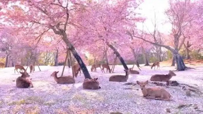 12. Стадо оленей отдыхает среди вишневых деревьев в городе Нара, Япония
