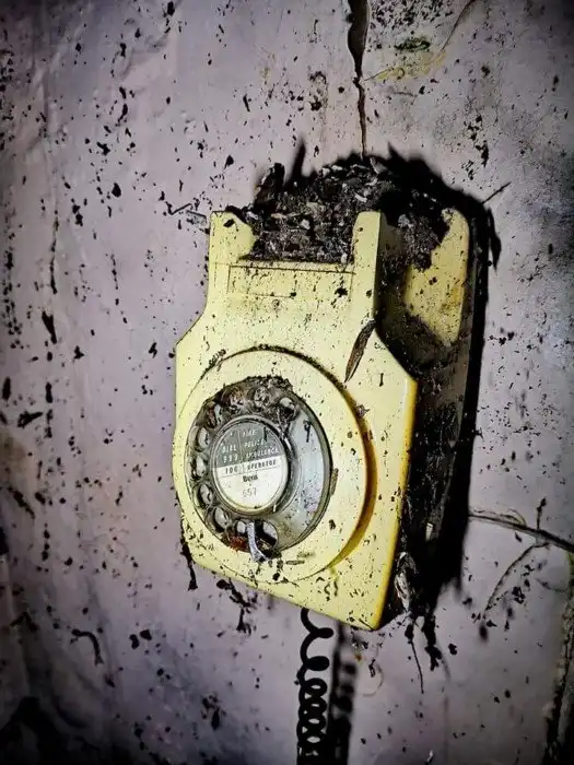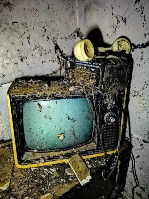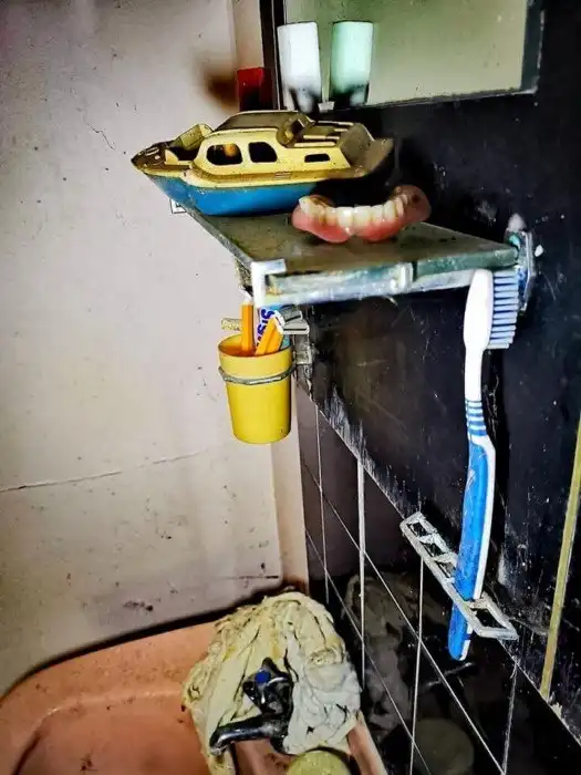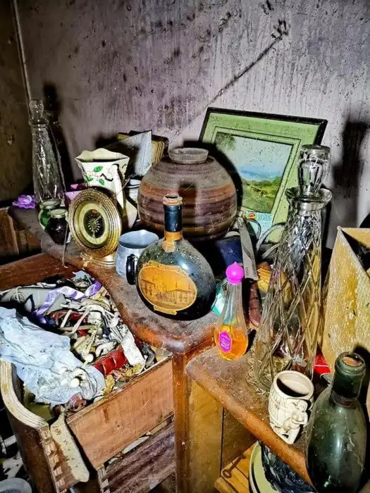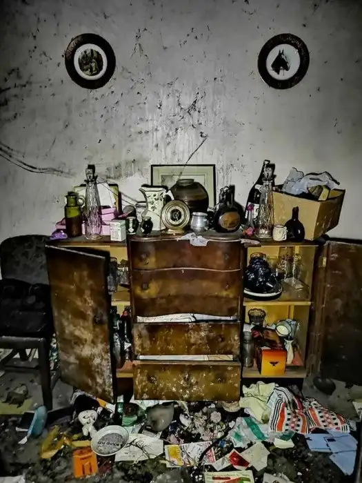 В шкафу сохранилась одежда, на кухне — ходунки, а в ванной — вставная челюсть бывшей владелицы дома. 86-летняя женщина умерла в 2003 году, и с тех пор дом стоит заброшенным.
